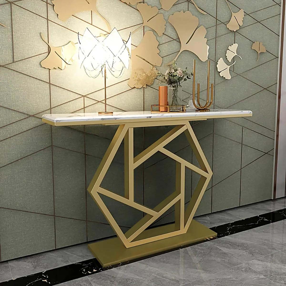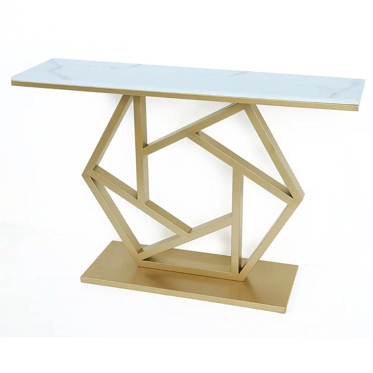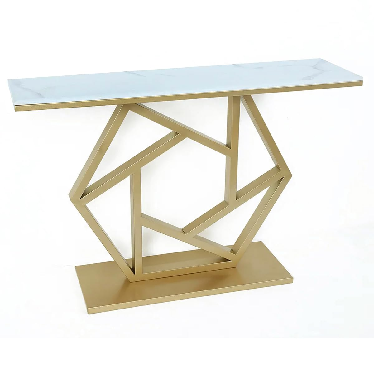 Bring bold design and refined elegance to your interior with this modern geometric console table, crafted to make a strong visual statement. The table features a sleek rectangular top supported by an artistic angular metal base, finished in a rich gold tone that adds instant luxury to any space.